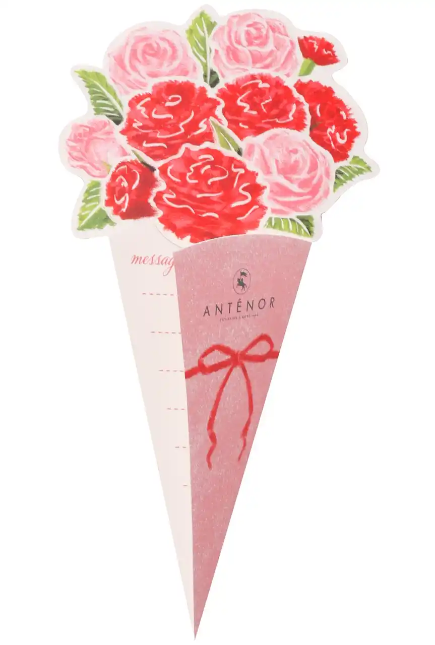 アンテノールの店頭にて商品をお買い上げいただいたお客様に、カーネーションの花束をデザインしたメッセージカードを無料でお付けいたします。 |