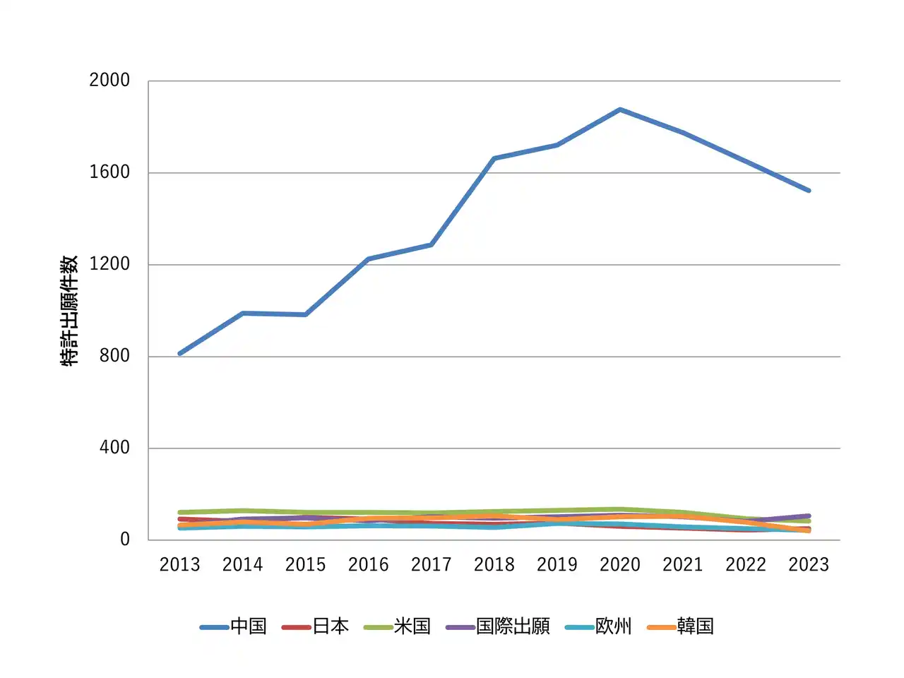 国別の出願件数では、全体の過半数を中国が占めています。本分野における研究開発の中心となっており、近年も一貫した増加傾向にあります。 |
