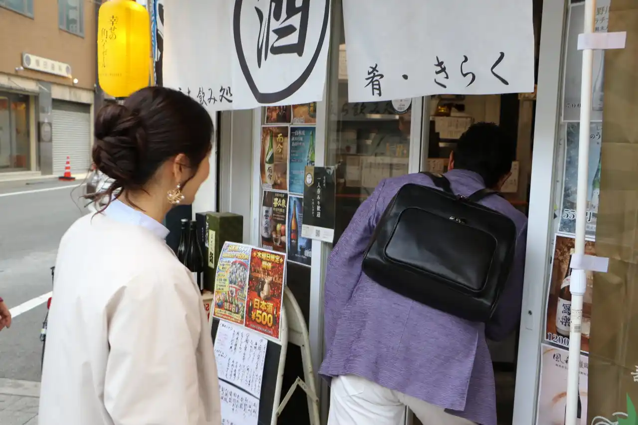 心を満たした2人が続いて向かったのは、去年12月にオープンした立ち呑み店【銘酒と地酒 肴・きらく】。こじんまりとした店内ながら、日本酒は40種類以上の品揃えです! |