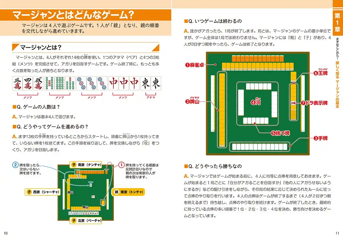 第1章 楽しく知るマージャンの基本 牌の種類や呼び方、「親・子」の役割、そして対局の準備から終わるまでの流れなど、基本の「き」を丁寧に学びます。 |