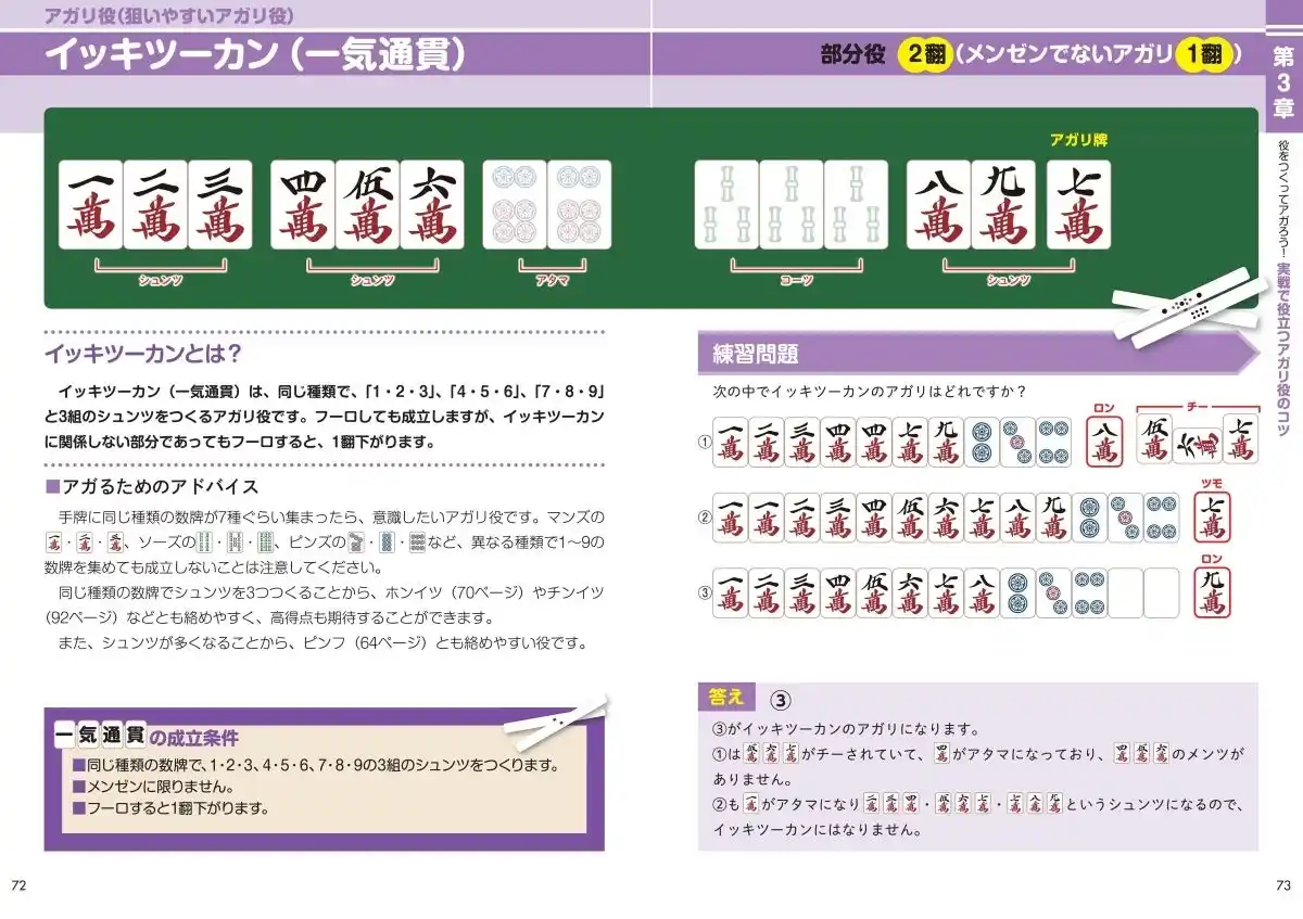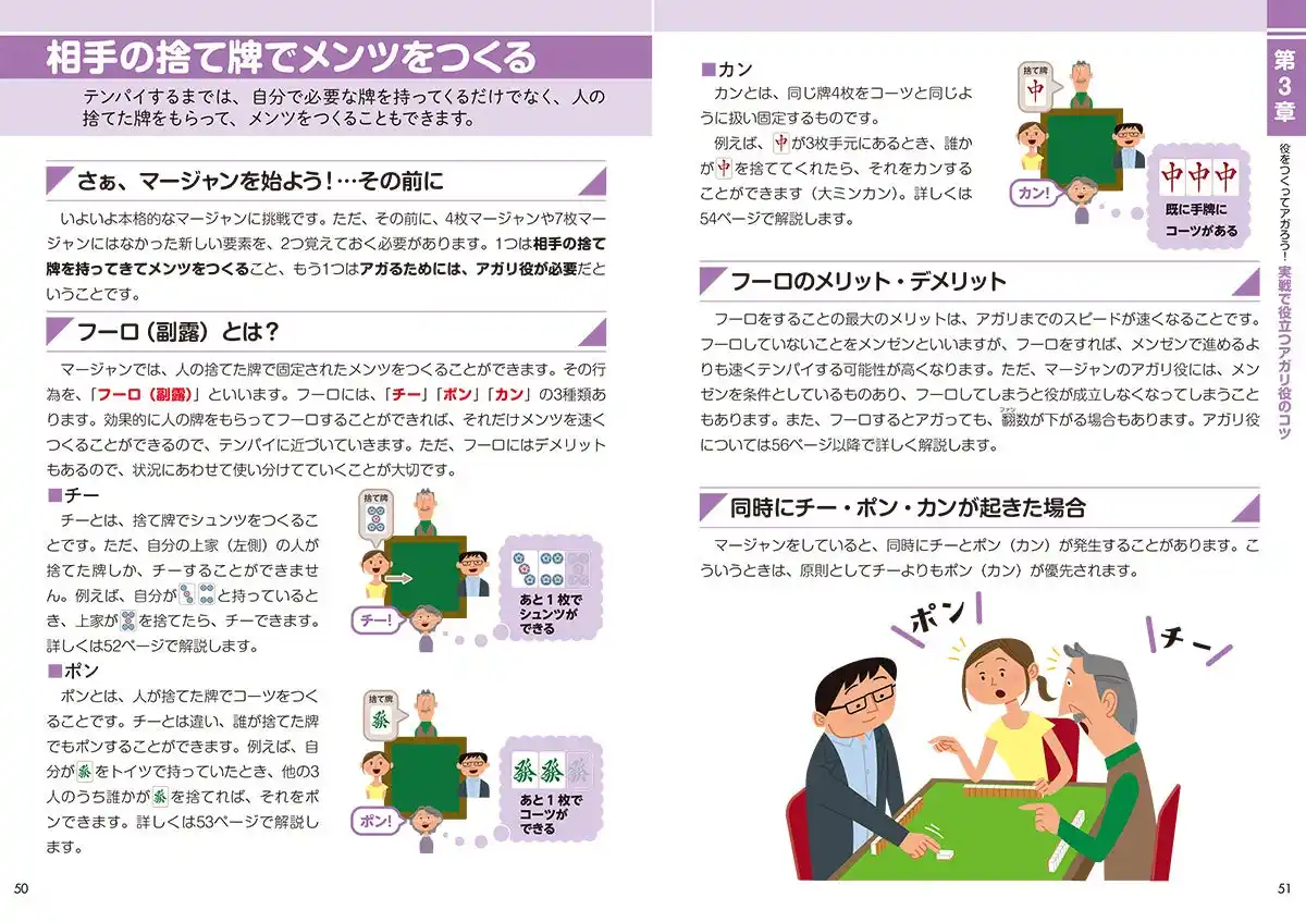 第3章 実戦で役立つアガリ役のコツ 相手の捨てた牌をもらって効率よく形を整える方法や、アガるために欠かせないさまざまな「役」の種類について詳しく解説します。 |