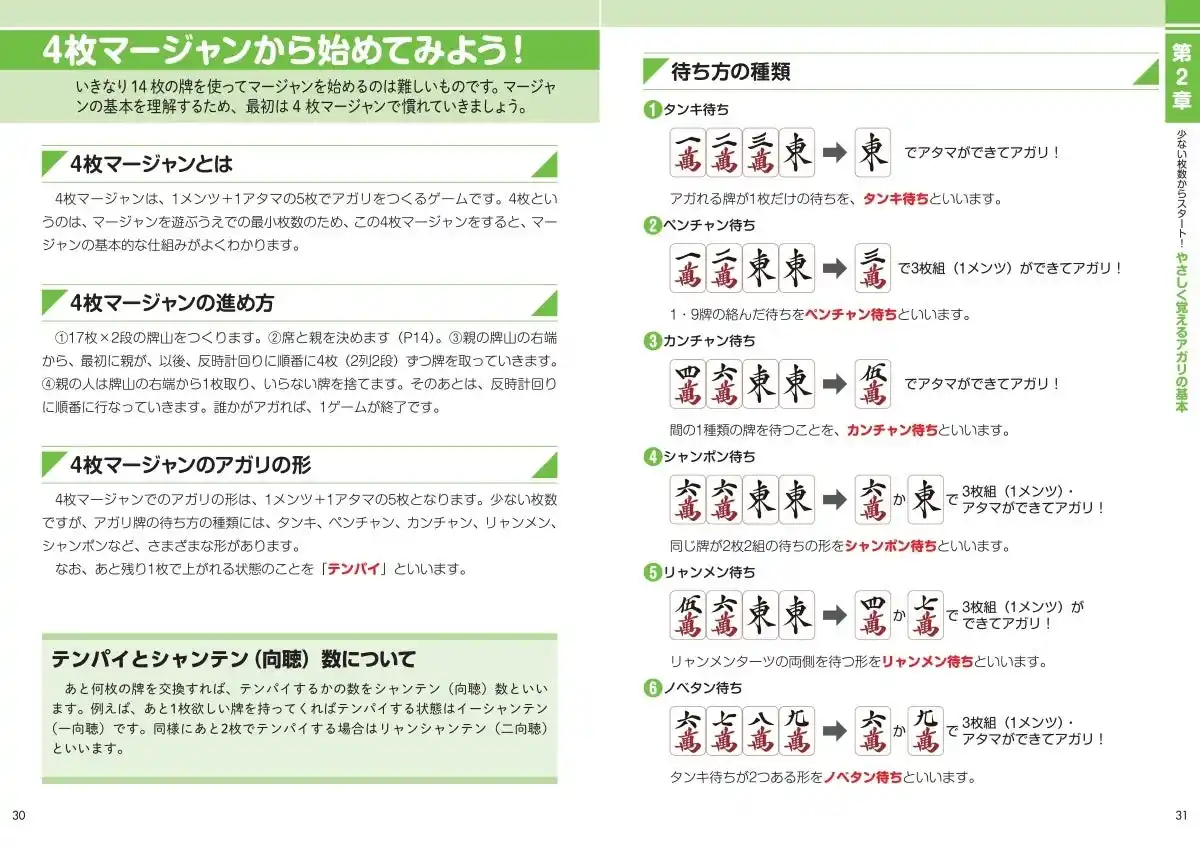 第2章 やさしく覚えるアガリの基本 4枚や7枚といった少ない枚数から練習を始め、アガリに欠かせない「3枚1組」のつくり方や、あと1枚でアガれる「待ち」の形をパズルのように楽しみながら身につけましょう。 |