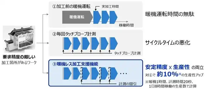 新たに追加されたオプションのタッチプローブ(*4) を利用して、暖機運転無しで安定した精度の加工を実現する、暖機レス加工支援機能を搭載。タッチプローブ計測で機械の熱によるズレ(熱変位)を補正することで、加工前の暖機運転や毎回の測定にかかる時間を減らし、サイクルタイムを短縮することが可能。 |