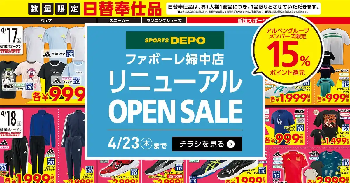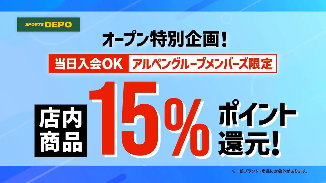 スポーツ用品販売の株式会社アルペン(本社:愛知県名古屋市、代表取締役社長:水野敦之)は、スポーツデポ ファボーレ婦中店、および「アルペン」から「スポーツデポ」へ業態変更する高岡店の同時リニューアルを記念し、オープンセールを開催いたします。 |