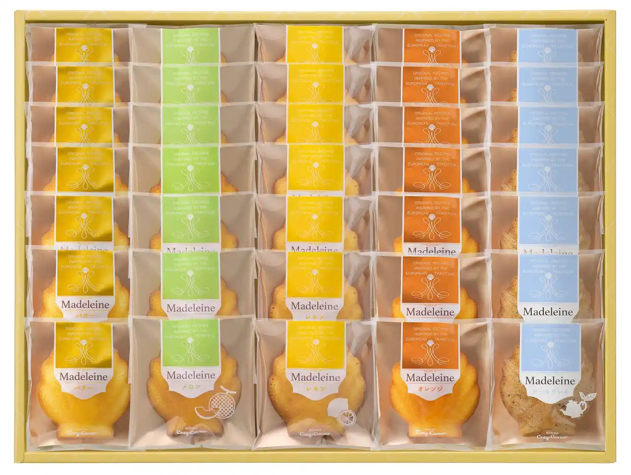 内容:マドレーヌ(レモン、メロン、バター、オレンジ、アールグレイ) 各7個 |