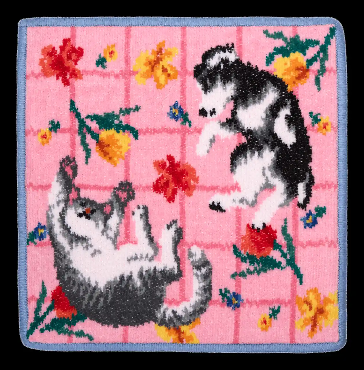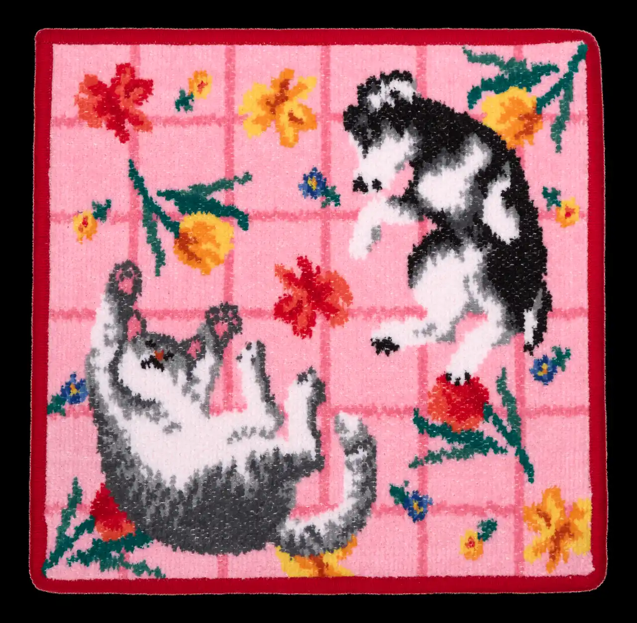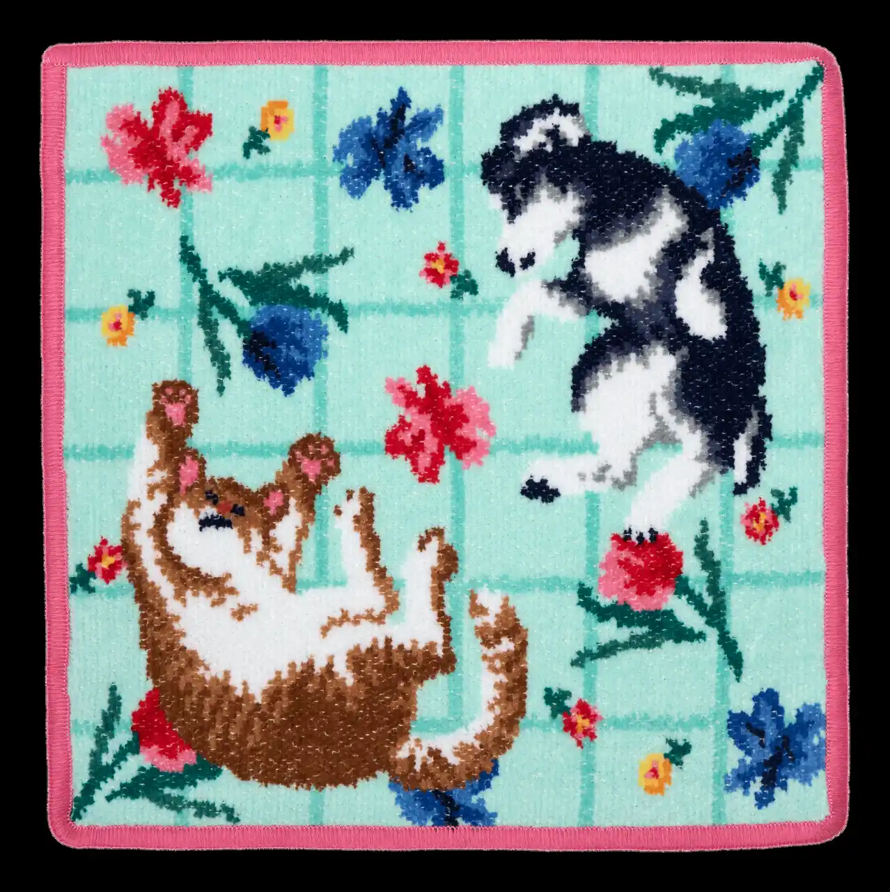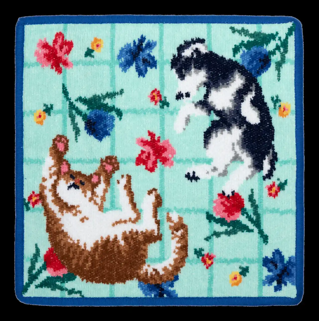 春の花々に包まれた犬と猫の幸せなひとときを、フェイラーならではの繊細なシュニール織で丁寧に表現しました。 |