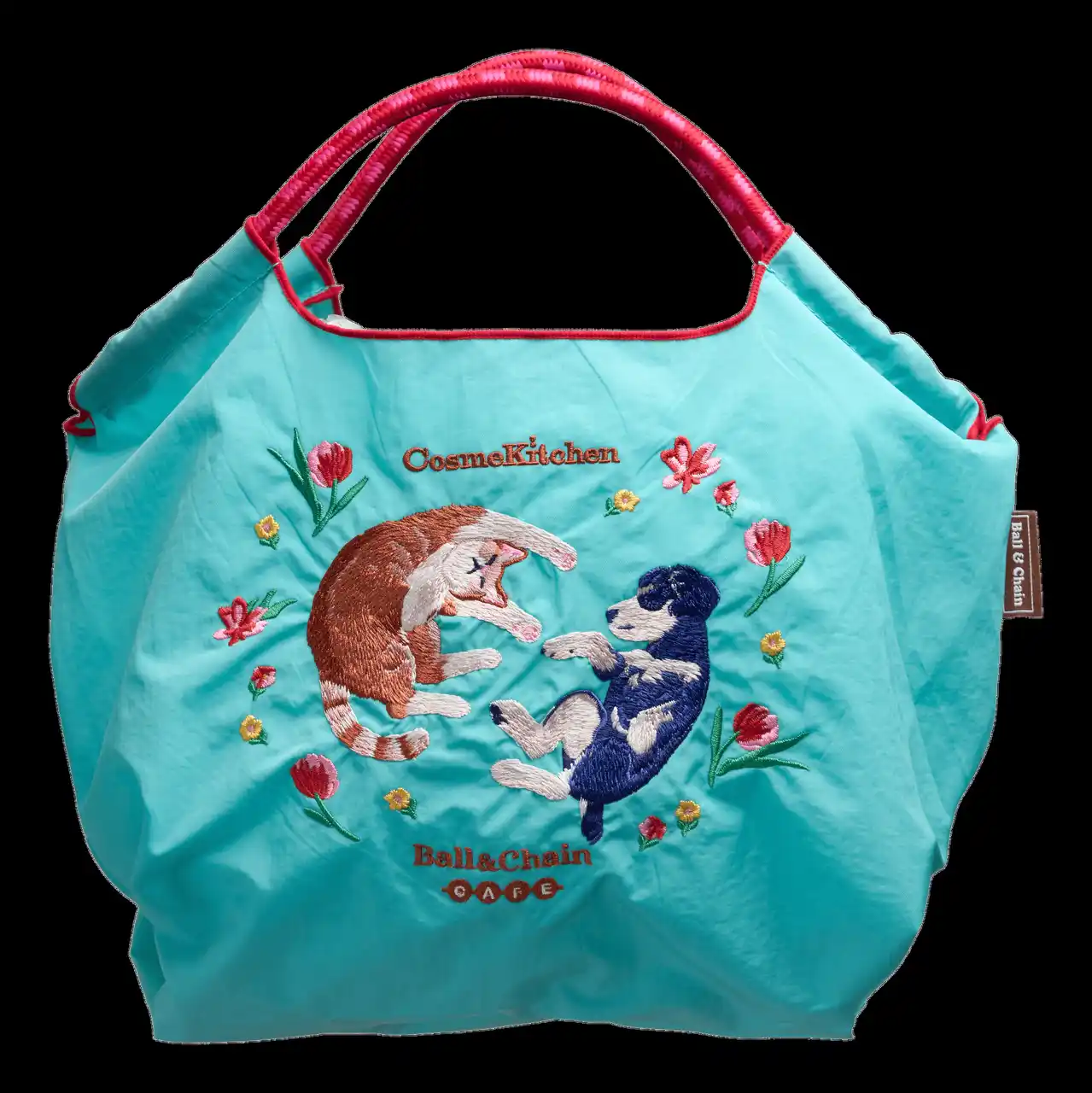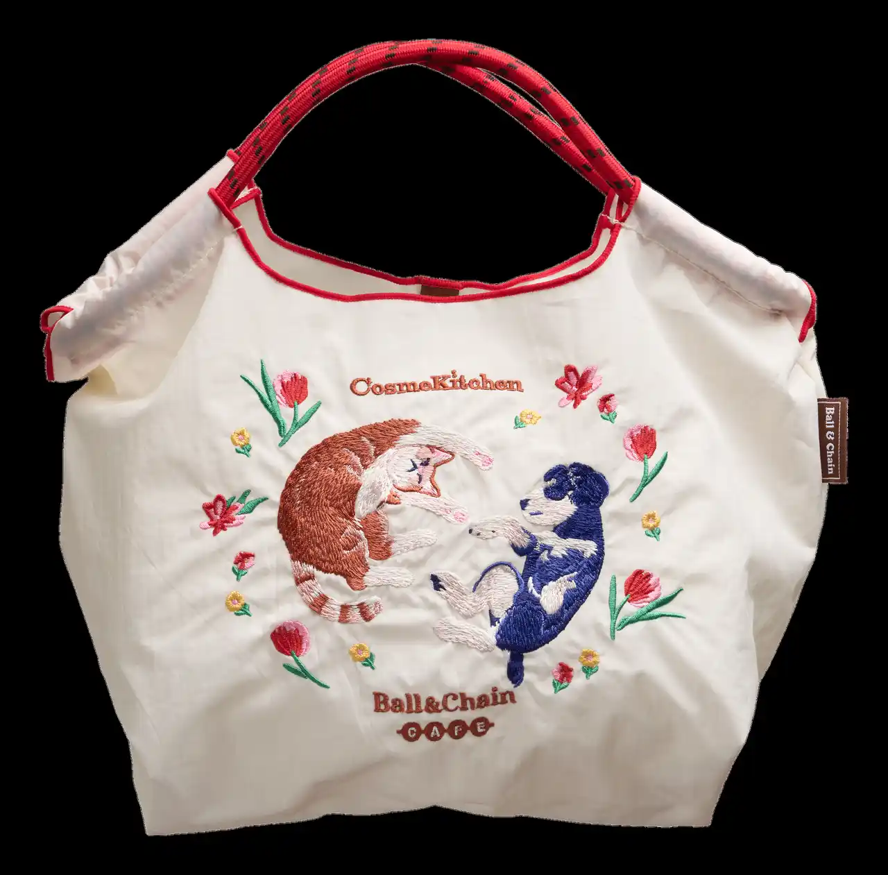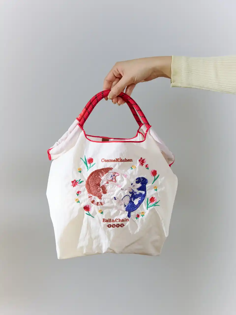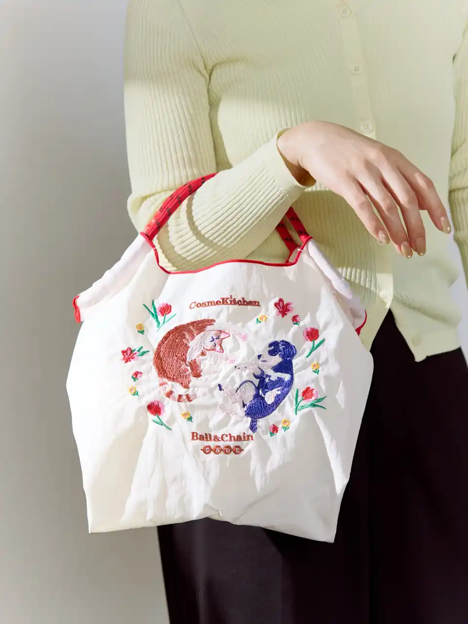 今回のコラボレーションではBall & Chain CAFE とのコラボレーションで、MSサイズのショッピングバッグ2種類とポーチを展開。 Ball & Chainならではの繊細な刺繍で、春の花々に彩られた犬と猫の幸福感あふれるひとときを描きました。 |