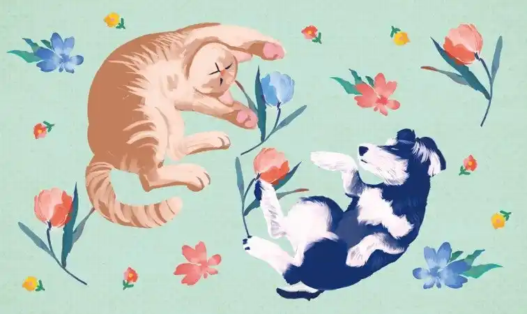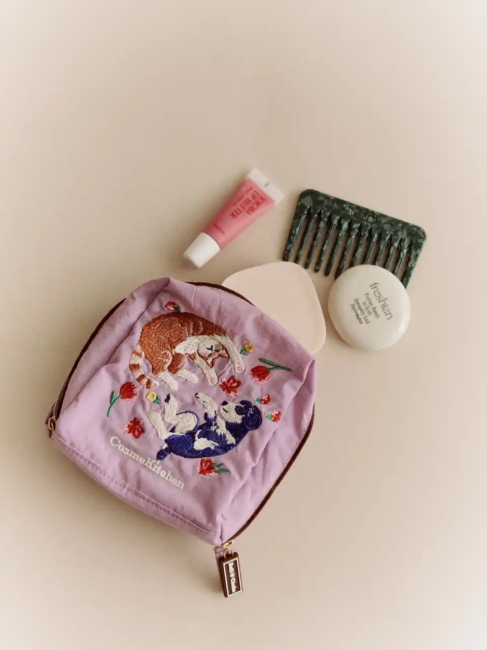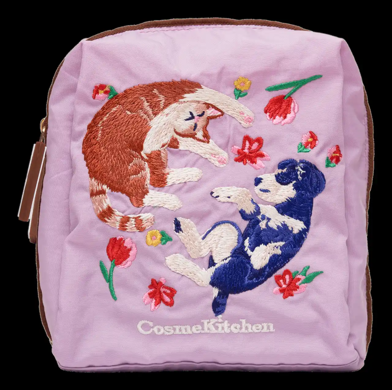 暖かな陽が差し込む花畑で寄り添いながら眠る犬と猫。見ているだけで心が温まる幸せなひとときを、<FEILER(フェイラー)>のシュニール織ハンカチと<Ball&Chain(ボールアンドチェーン)>の刺繍バッグ&ポーチに宿らせたコスメキッチンが贈る春のコレクション |