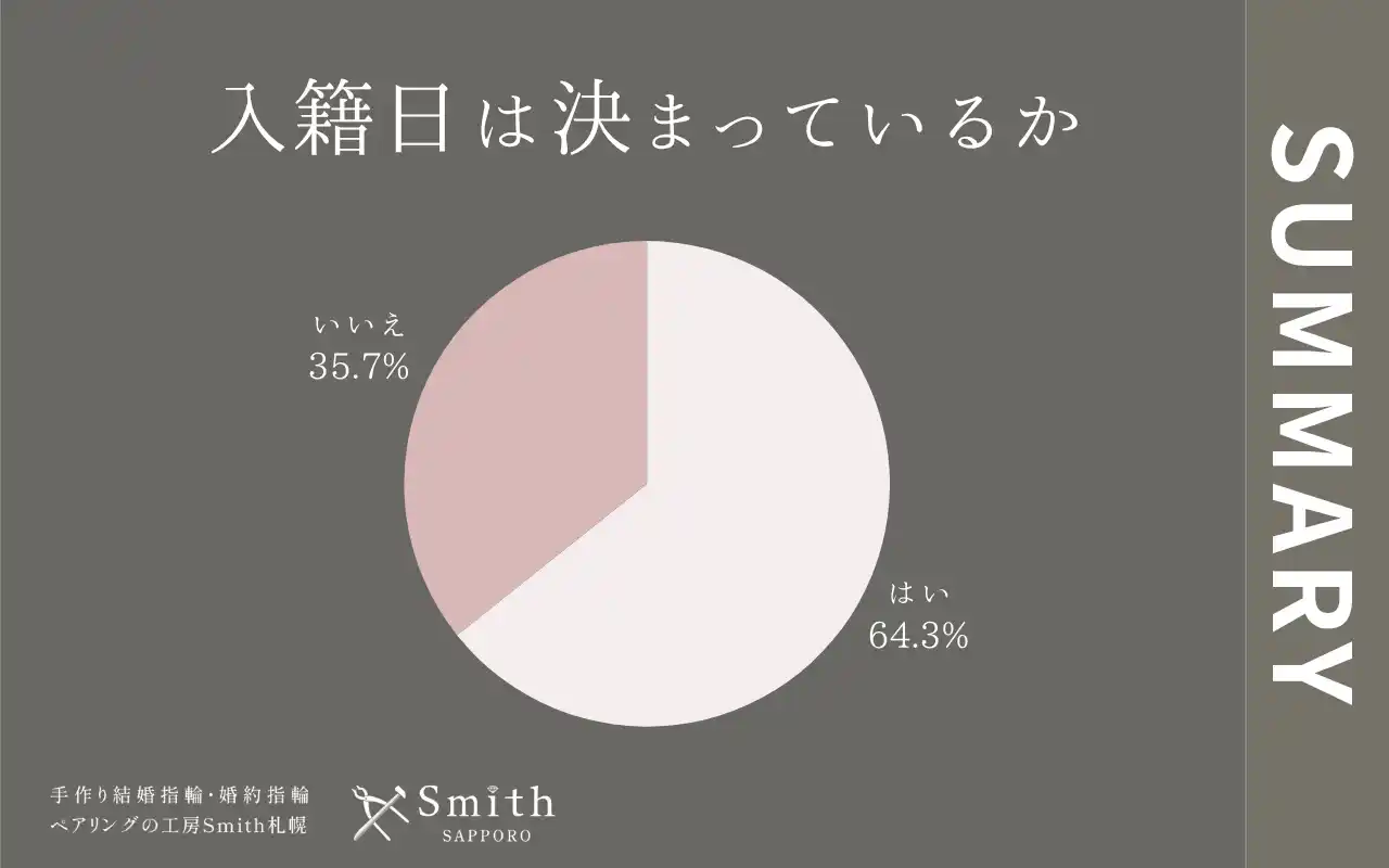 「入籍日は決まっているか」という質問に対し、「はい」と回答された方が64.3%、「いいえ」と答えられた方は35.7%という結果となりました。 |
