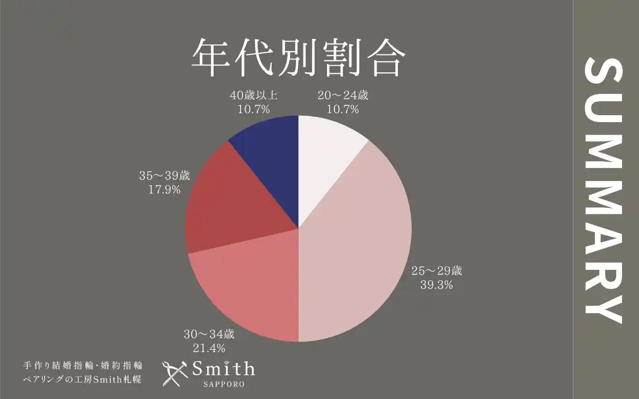 次いで「30~34歳」が21.4%、「35~39歳」が17.9%と続いており、20代後半から30代後半にかけての層で全体の約8割を占めています。人生の大切な節目に、量産品ではなくおふたりの手で作り上げた世界にひとつの指輪を選びたいという想いが、若い世代を中心に広く響いている結果といえます。 |