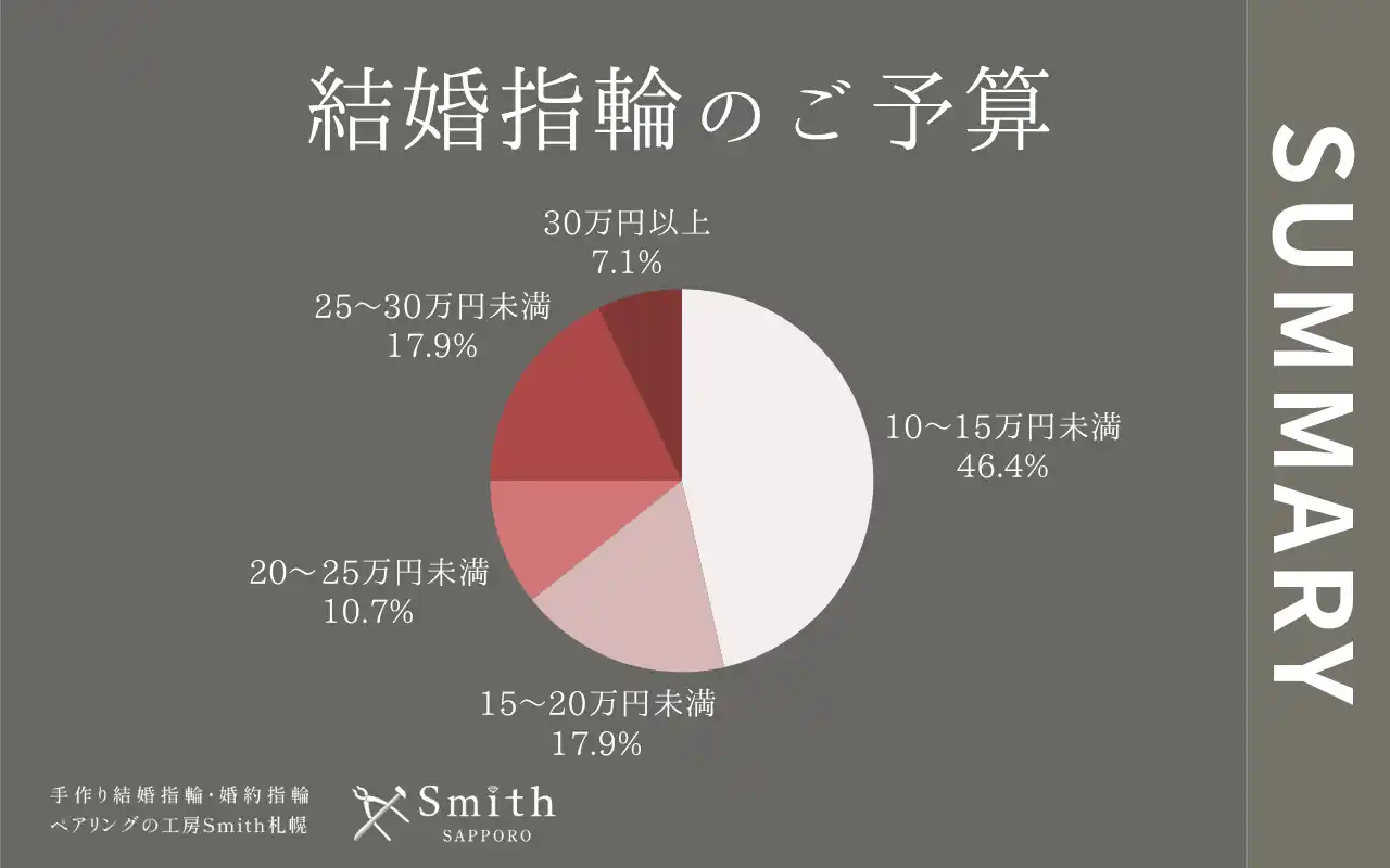 一方で、25万円以上の高価格帯をお選びになったお客様も全体の約25%いらっしゃいました。予算の幅はさまざまでも、共通しているのは「量産品ではなく、おふたりだけの指輪を自分たちの手で作りたい」というお気持ちです。工房Smith札幌本店では、ご予算に関わらず、おふたりが納得のいく一本を一緒に作り上げるお手伝いをさせていただいております。 |
