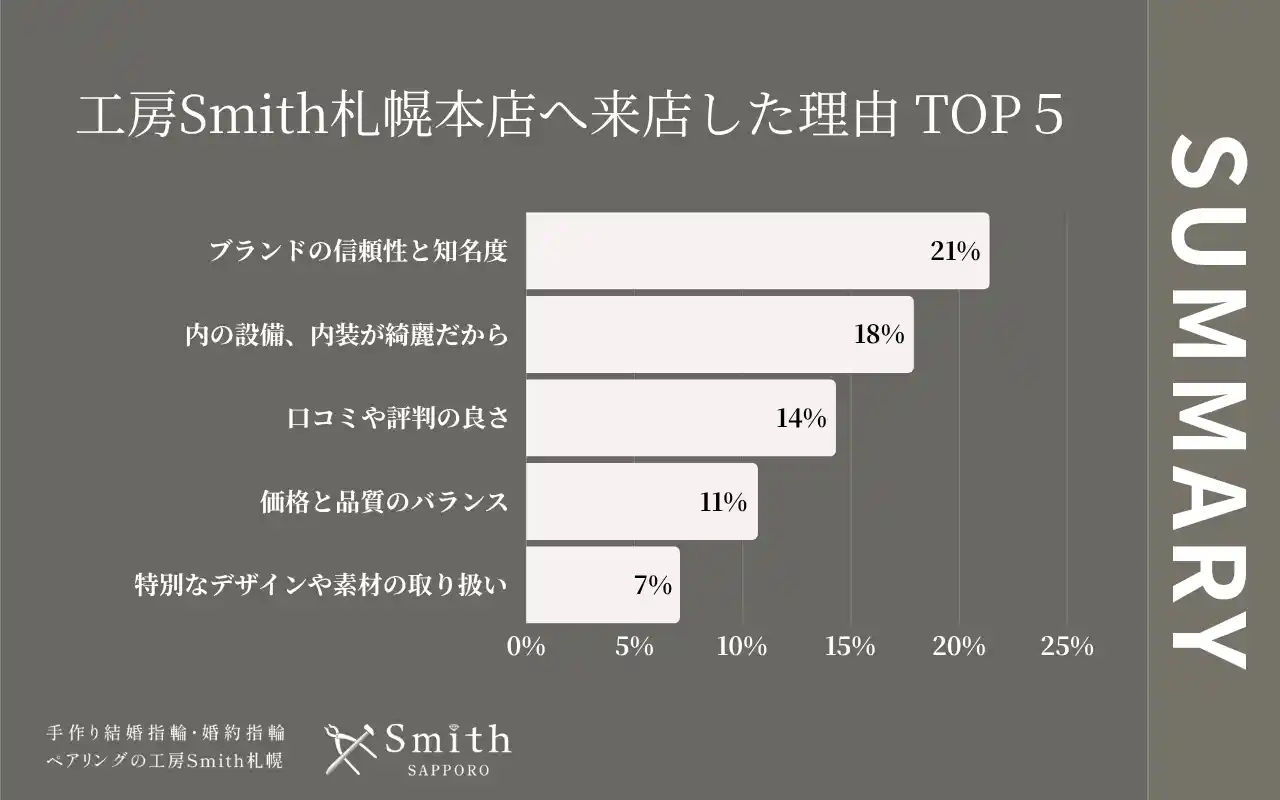 今月注目すべきは、「ブランドの信頼性と知名度」がトップとなった点です。工房Smith札幌本店が長年にわたって積み重ねてきた実績や品質への信頼が、新たなカップル様のご来店動機として確かな存在感を示した月となりました。知名度という目に見える形で評価していただけることは、これまでのお客様おひとりおひとりとの丁寧なものづくりが、ブランドとしての信頼へとつながっている表れと言えるでしょう。 |