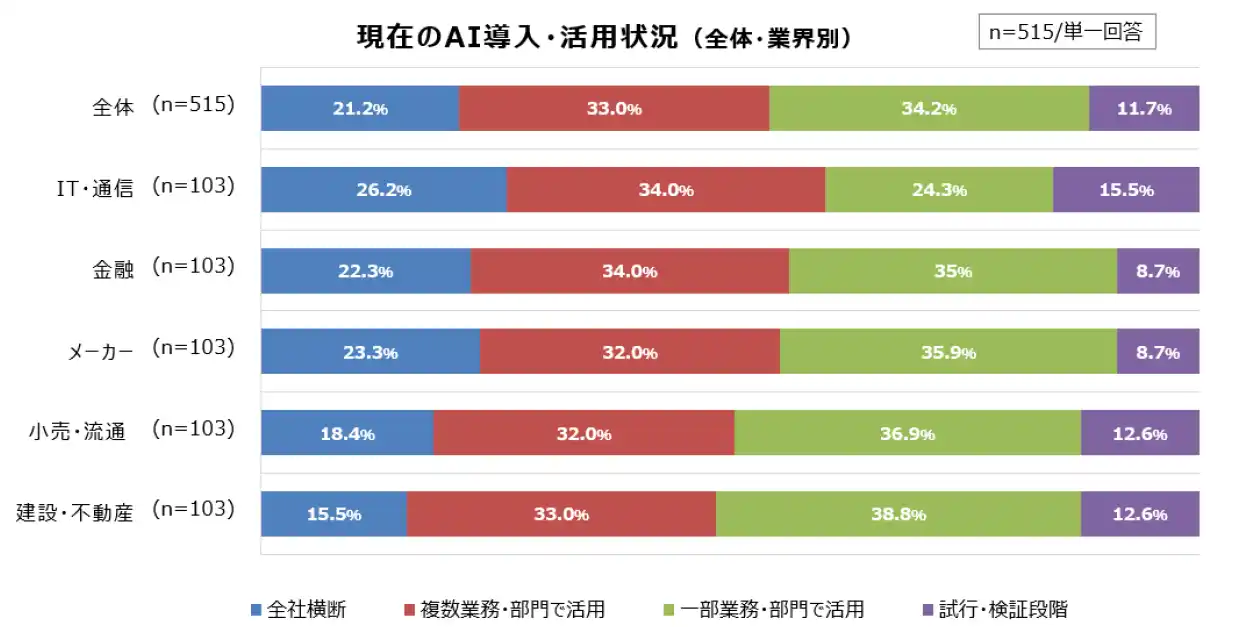 | 対象 :従業員数501人以上 AIツールを導入・活用している企業において、人事もしくは採用にかかわる22~69歳の担当者515人(IT通信、金融、メーカー、小売・流通、建設・不動産から各103サンプル) | |||||||||||||