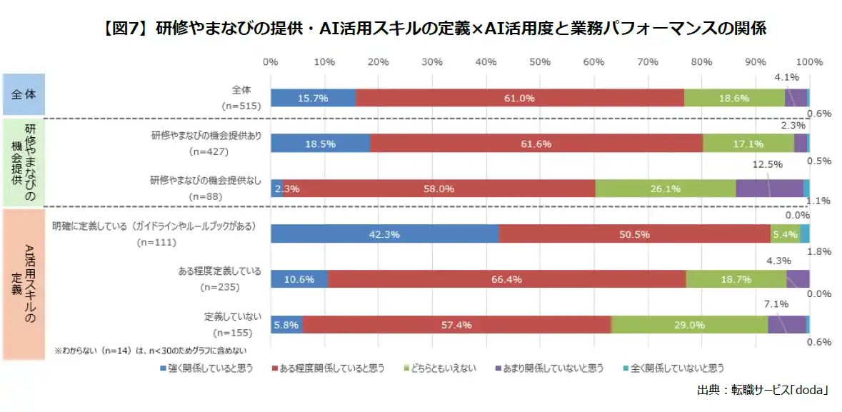 約8割が、AI活用度と業務パフォーマンスは「関係していると思う」。研修や評価を後押しする背景に