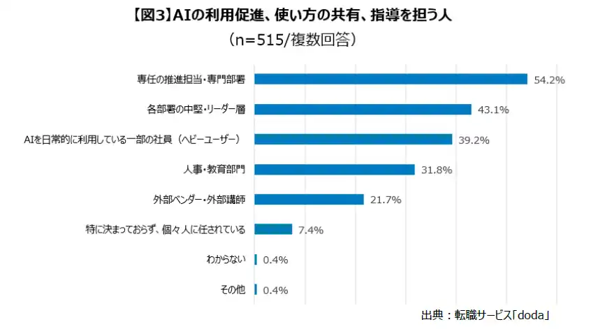 | また、AIの活用促進やツールの使い方に関する共有・指導を誰が担っているか複数回答で聞いたところ、「専任の推進担当・専門部署」が54.2%で最も高くなりました【図3】。 | |||||||||||||