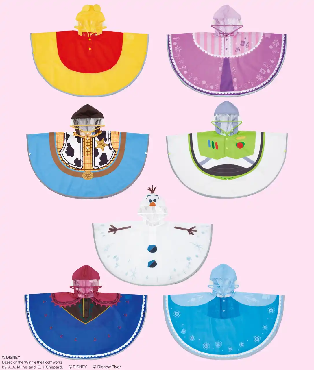 『トイ・ストーリー』の「ウッディ」や「バズ」、『アナと雪の女王』の「アナ」、「エルサ」、「オラフ」、そして『塔の上のラプンツェル』の「ラプンツェル」、『くまのプーさん』の「プーさん」といった大人気キャラクターの衣装を忠実に再現したデザインを採用しています。 |
