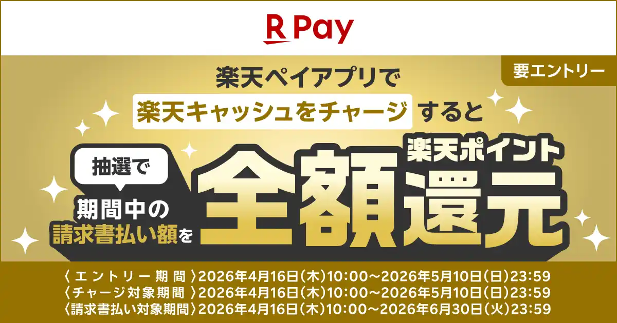 エントリー期間: 2026年4月16日(木)10:00 ~ 2026年5月10日(日) 23:59 チャージ対象期間: 2026年4月16日(木)10:00 ~ 2026年5月10日(日)23:59 請求書払い対象期間: 2026年4月16日(木)10:00 ~ 2026年6月30日(火)23:59 |