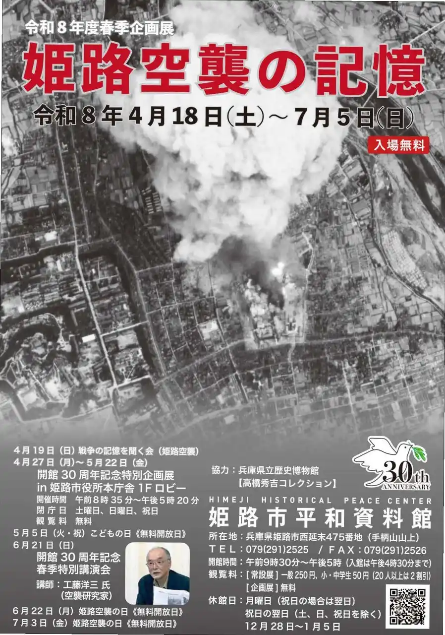 | 開館30年を迎えるにあたり、姫路空襲についての被害状況や戦前・戦後の変貌ぶりを写真パネル中心に、館蔵資料とともに展示します。また、防空壕の模型にて体感も可能。 |