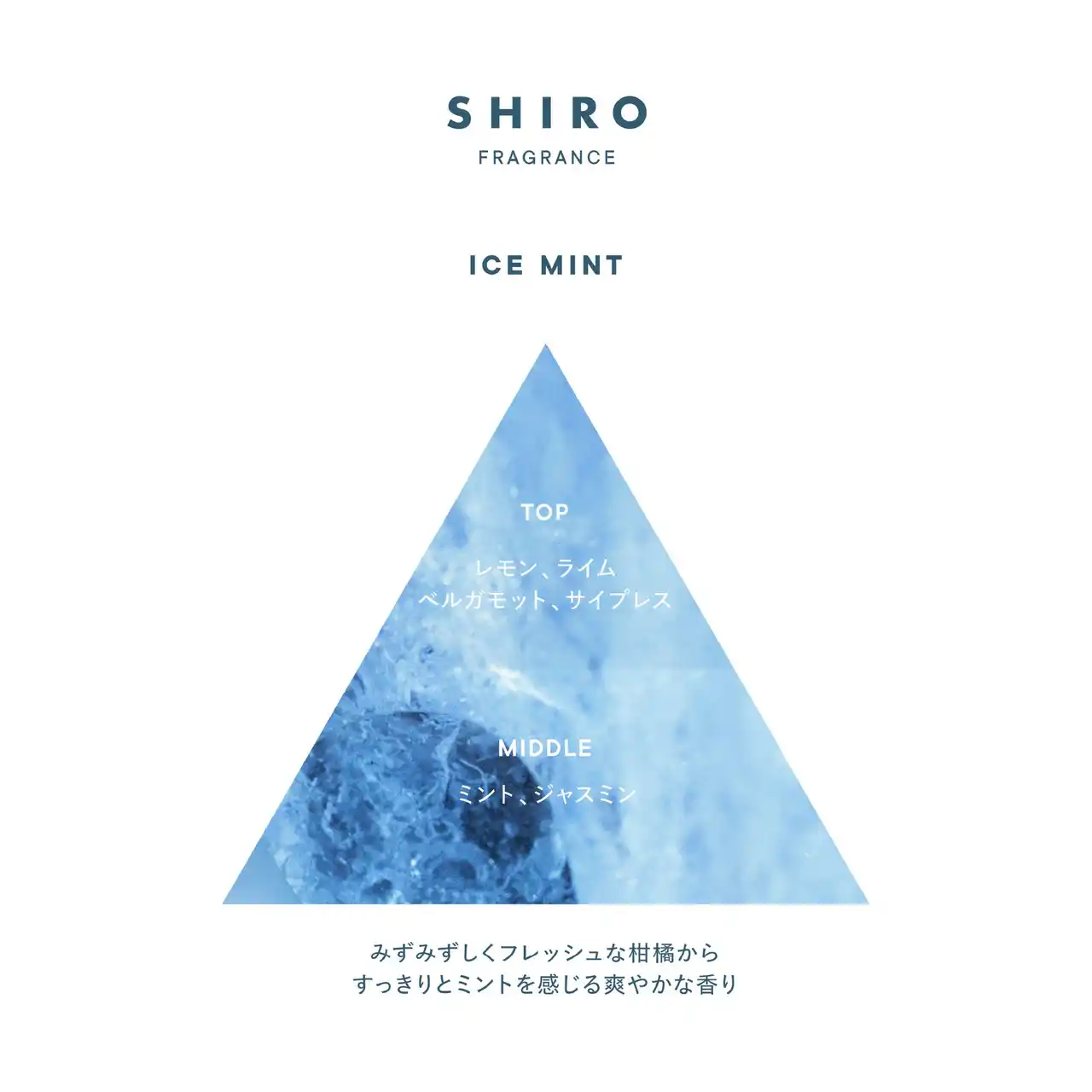 シュッっとひと吹きした瞬間、目が覚めるようなメントール*1が突き抜け、トップノートのレモンやライム、ベルガモット*9のフレッシュなみずみずしさが重なります。爽やかな柑橘系からやがて、凛としたミントとジャスミンのフローラルが溶け合うミドルノートへと移り変わります。肌に心地よいクール感*6をまとわせながら、清潔感と爽快感あふれる香りが全身を包み込み、気分をリフレッシュさせてくれる香りです。 |
