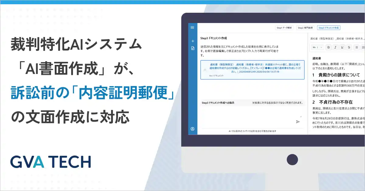 GVA TECH株式会社(本社:東京都渋谷区、代表取締役:山本俊、以下「GVA TECH」)が提供する裁判特化AIシステム「AI書面作成」において、訴訟前のフェーズである任意交渉段階での「受任通知書」「内容証明郵便」の文面作成に特化した機能を、拡充したことをお知らせいたします。 |