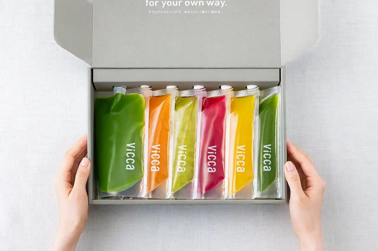 『Vicca』は、現代人の健康的なライフスタイルを実現するため、「フルーツを飲む」という新しい健康習慣を提案し、“フルーツウェルネス”の実現を目指す“ダブルプレスジュース”ブランドです。1本で1日に必要なフルーツ約200gを手軽に摂取できるジュースを、冷蔵便による定期配送サービスでご自宅までお届けします。 |