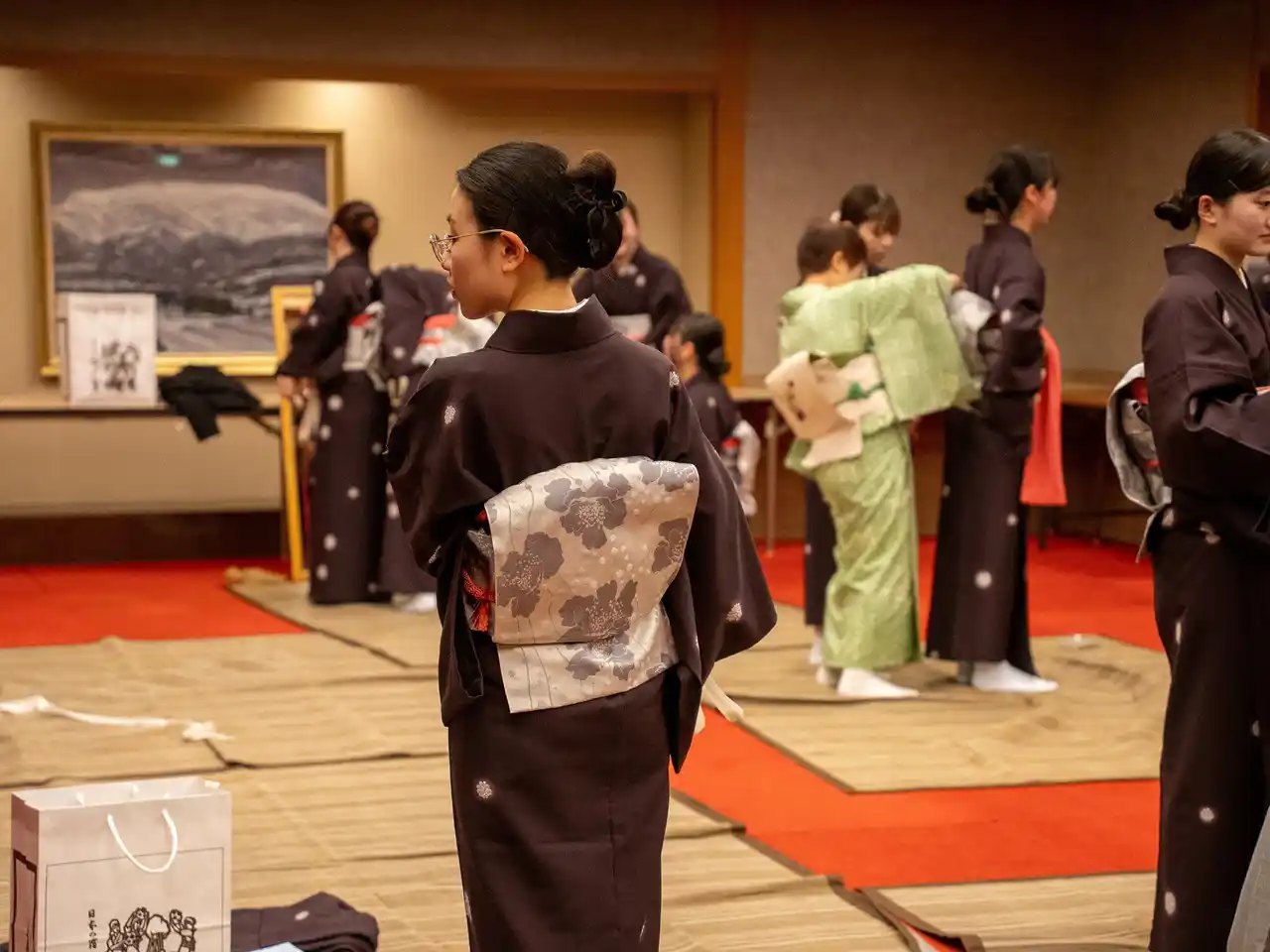 日本の宿古窯・あつみ温泉萬国屋では、風情ある日本文化を発信するために着物を着用してお客様をもてなします。2日間で帯の結び方や裾の取り方などの着方を学び、スムーズに着用する手順を学びます。 |