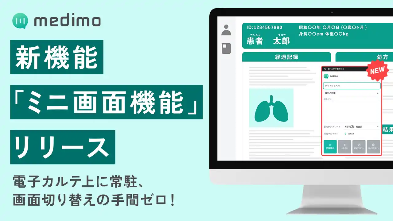 | 医師率いる医療AIスタートアップ株式会社medimo(本社:東京都港区、代表取締役社長:中原 楊)はが提供する、AIによる診療録作成支援サービス「medimo(メディモ)」において、PC画面上でmedimoをコンパクトに表示・操作できる新機能「ミニ画面機能」を実装したことをお知らせいたします。 | |||||||||