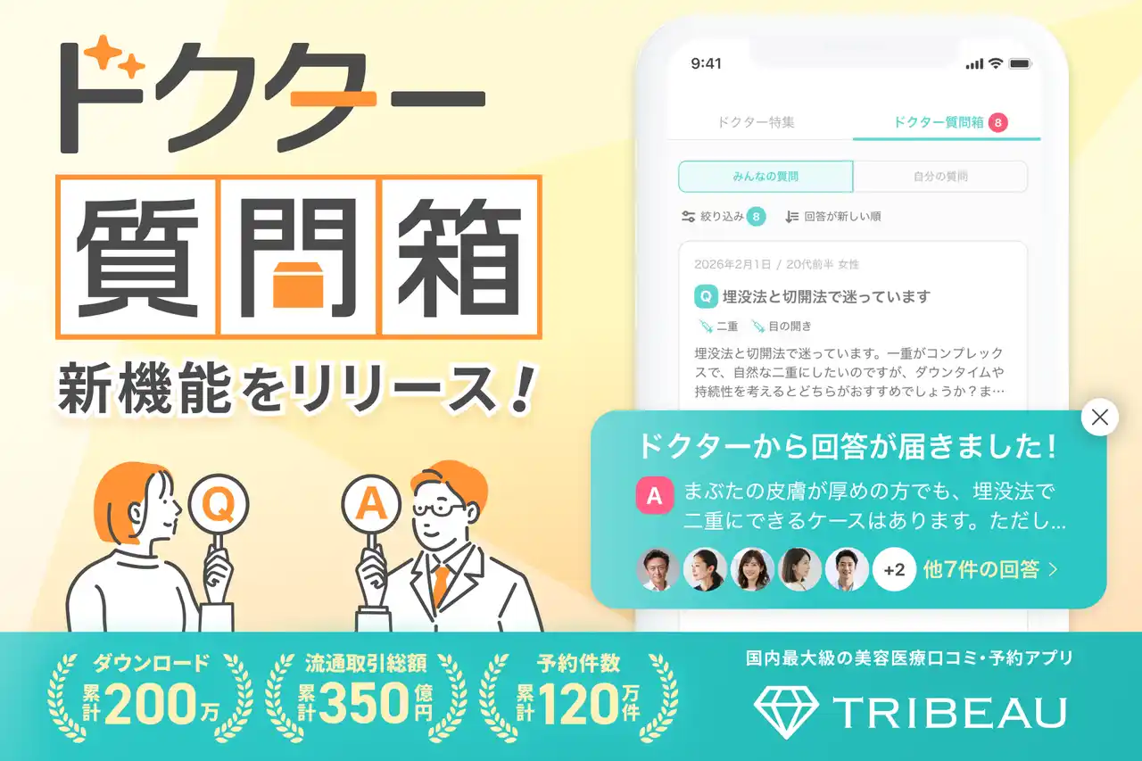 国内最大級の美容医療口コミ・予約アプリ『トリビュー』を開発・運営する、株式会社トリビュー(本社:東京都渋谷区、代表取締役:毛迪、以下 当社)は、2026年3月23日、複数のドクターに匿名で質問・相談ができる新機能「ドクター質問箱」の提供を開始したことをお知らせいたします。当社はこの機能を通じて、美容医療における情報収集のハードルを下げ、ミッションである「ありたい自分でいられる世界の実現」を加速させてまいります。 |