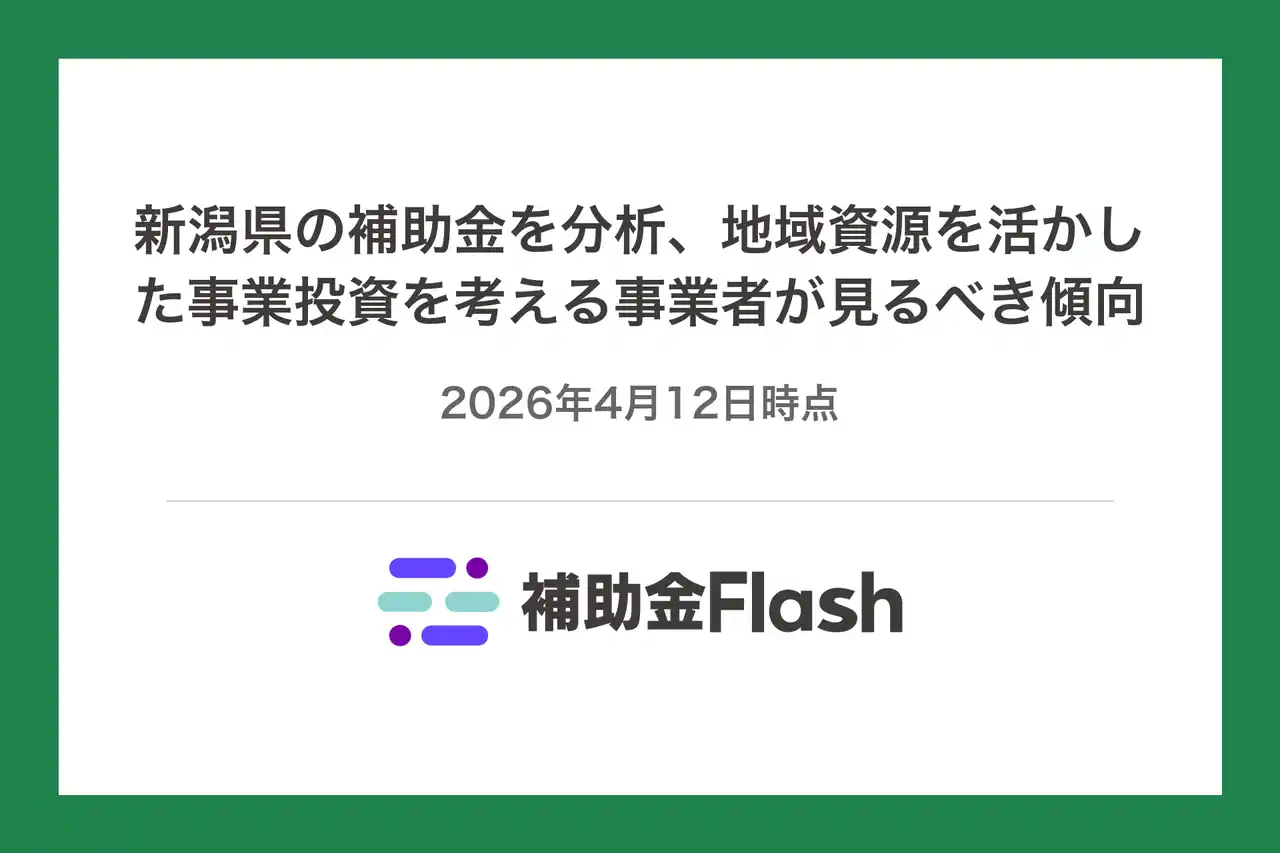 | 中小企業・個人事業主が活用できる補助金・助成金は、地域によって件数や用途の構成が異なります。新潟県で利用可能な支援制度の全体像を把握することは、事業計画の検討において有用な情報となります。 | ||||||||||||||||