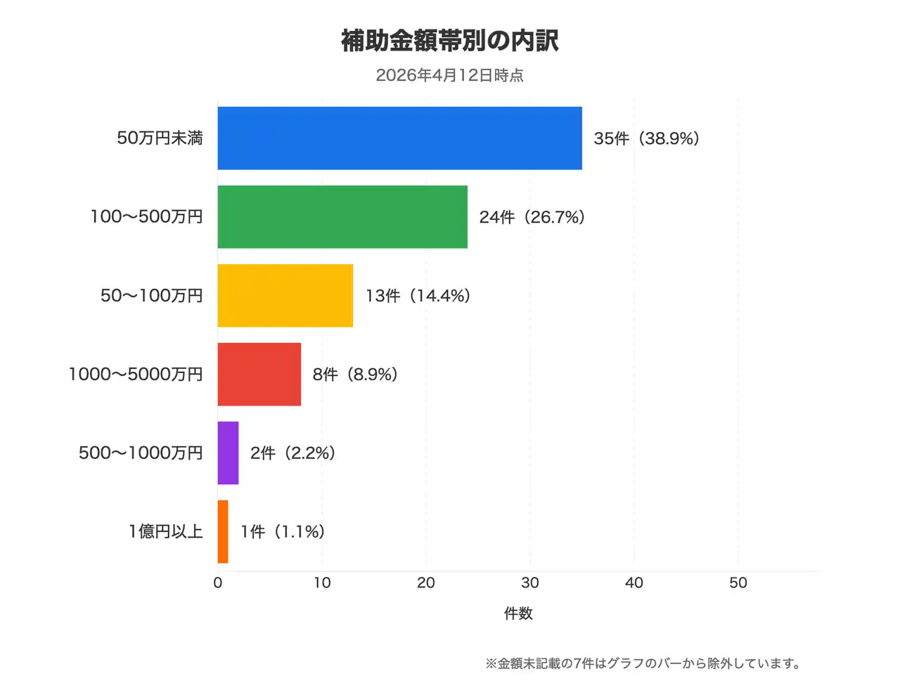 | 看板の設置や備品の購入など、少額の投資から始められる制度が4割弱を占め、1,000万円超の大型設備更新まで対応する制度も9件確認されています。 | ||||||||||||||||