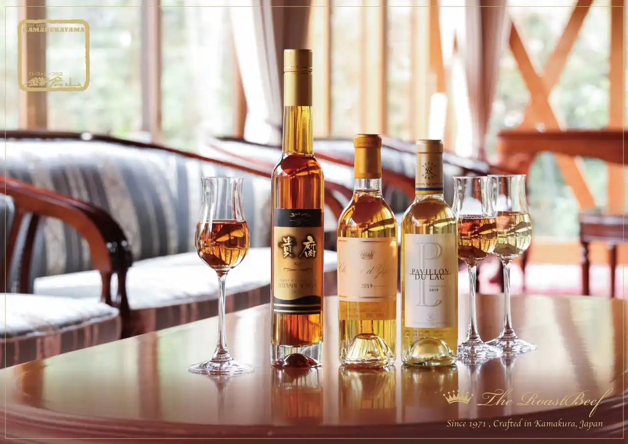 皆様の特別なひとときに向けて、鎌倉山では芳醇な香りととろけるような甘みを持つ「貴腐ワイン」をご用意いたしました。食前・食後酒として親しまれる貴腐ワインですが、その凝縮された甘みは、当店の黒毛和牛ローストビーフと美しいマリアージュを奏でます。 |