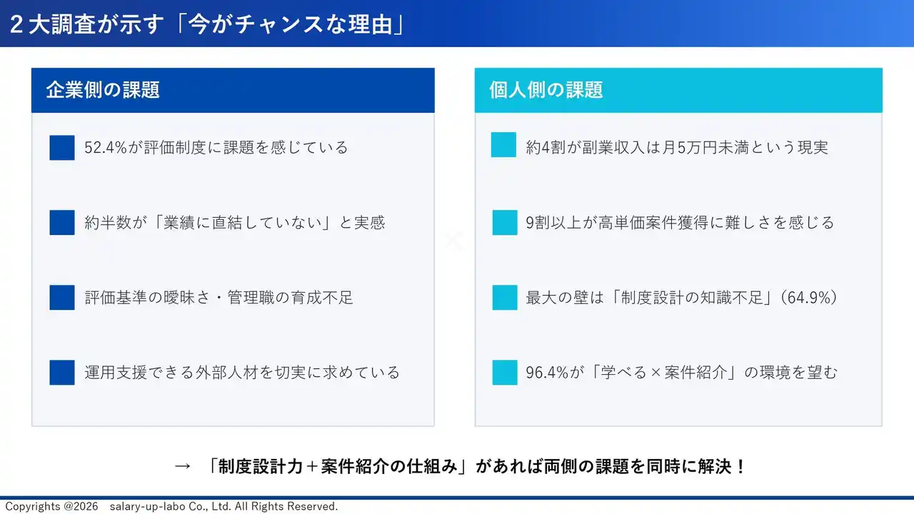 株式会社給与アップ研究所(本社:東京都渋谷区、代表取締役:高橋恭介)は、2026年4月2日(木)に無料オンラインウェビナー「AIに代替されない人事専門スキルを学ぶ!最新2大調査で読み解く『人事評価コンサルタント』の需要と市場価値」を開催いたしました。 |