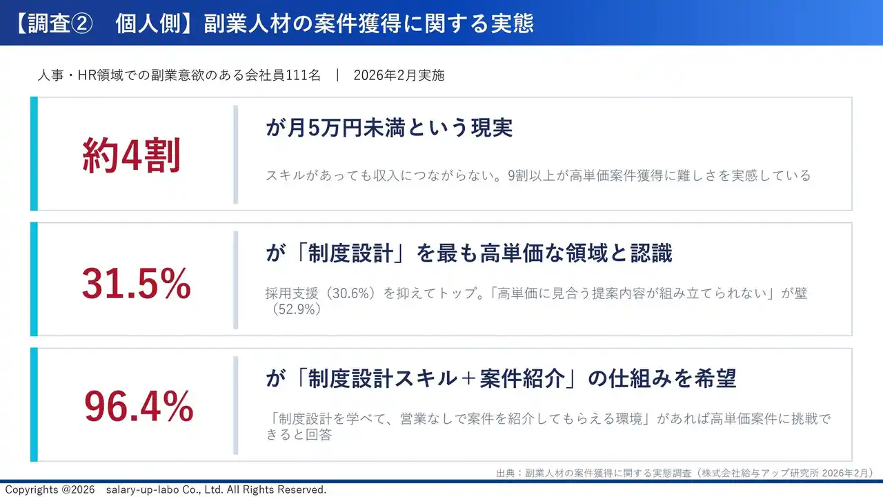 人事・HR領域で副業意欲のある人材の約4割が「月5万円未満」にとどまっており、スキルが収入につながっていない実態が明らかになっています。 |