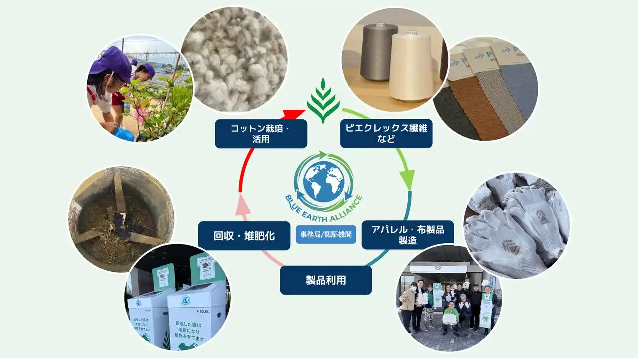 衣類廃棄と耕作放棄地という2つの社会課題の同時解決を目指し、「地着・地消・地循」の地域完結型・資源循環モデルを推進する協議会。P-FACTS製品を軸に、コットン栽培から製品化、使用、回収、堆肥化、そして再び農業へという循環の輪をつなぐプラットフォームとして、企業・自治体・団体の参画を促進している。 |