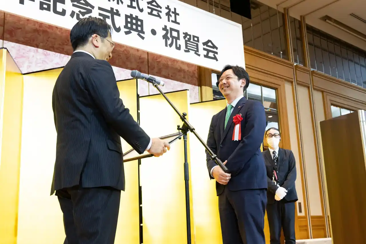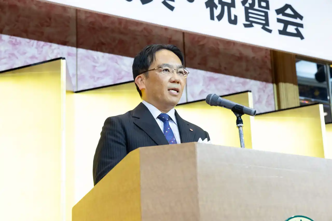 | 式典の終盤には、会長 栗山義広より、これまでの歩みを支えてきた関係者への感謝が述べられ、創業期を支えた恩人とのエピソードが紹介されました。 | |||||||||
