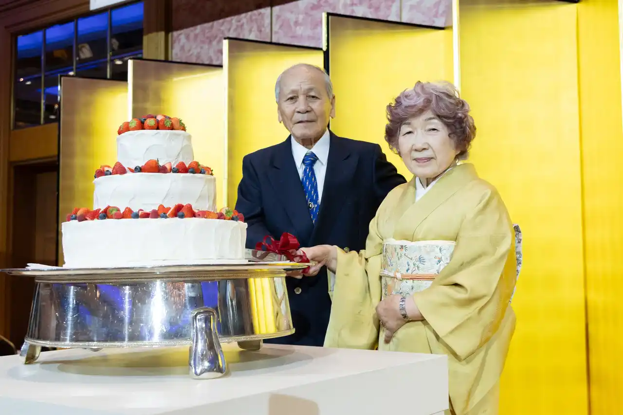 | 祝賀会では、同社創業者夫婦のダイヤモンド婚(結婚60年)を祝うセレモニーが行われました。 | |||||||||