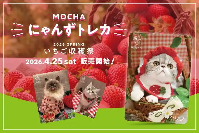 「猫と過ごす、豊かなひととき」をコンセプトとし、全国に猫カフェを展開するリポット株式会社(本社:東京都新宿区、代表取締役社長:守永圭治)は大人気オリジナルアイテムの最新作『MOCHAにゃんずトレカ~2026 Spring~いちご収穫祭』を、2026年4月25日(土)より全国の猫カフェMOCHA全36店舗にて販売開始いたします。 |