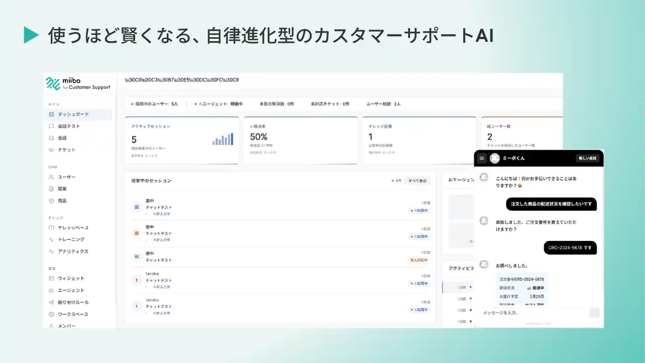 「miibo for カスタマーサポート」は、AIによる一次対応と有人対応を組み合わせ、問い合わせ対応の中でナレッジが更新されることで、精度と対応範囲が広がっていくカスタマーサポートAI SaaSです。 |