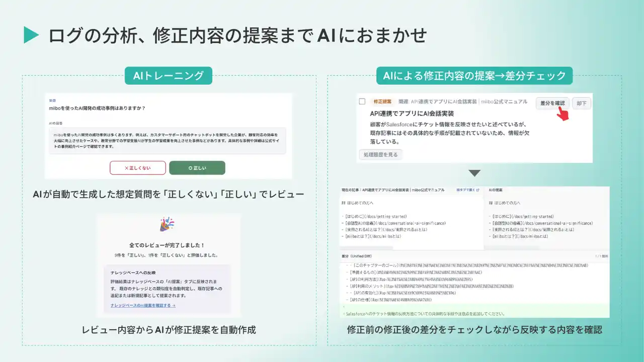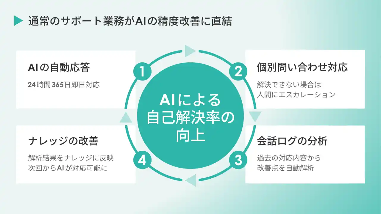 これをもとにナレッジが更新されることで、AIの精度向上と対応範囲の拡大が継続的に進みます。 |