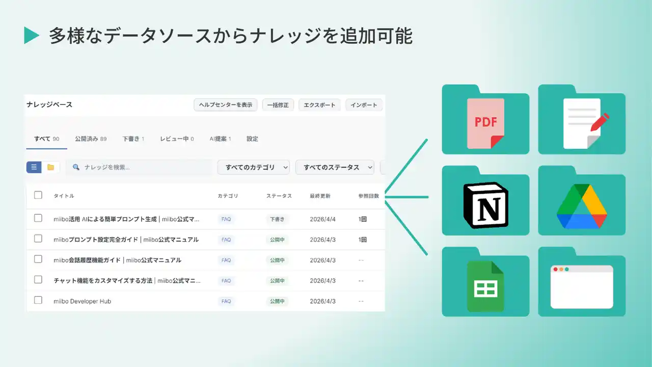 ナレッジを登録することで、非エンジニアでもAIによる問い合わせ対応を立ち上げやすく、現実的かつスピーディに運用を開始できます。 |