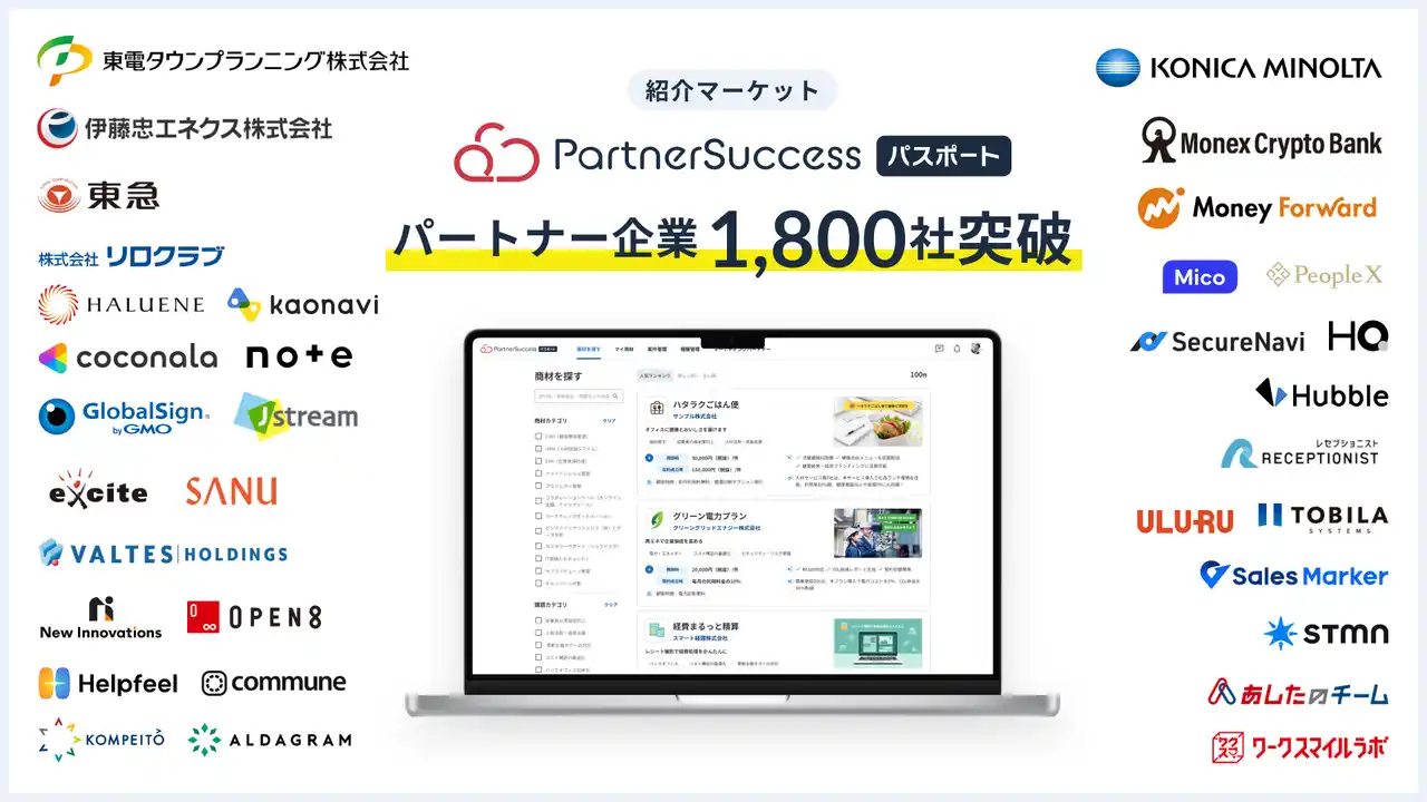 パートナーサクセス株式会社(本社:東京都港区、代表取締役 CEO:永田雅裕)が運営する紹介マーケット「PartnerSuccess パスポート」は、2025年4月の正式リリースから1年で、パートナー企業数が1,800社を突破しました。 |
