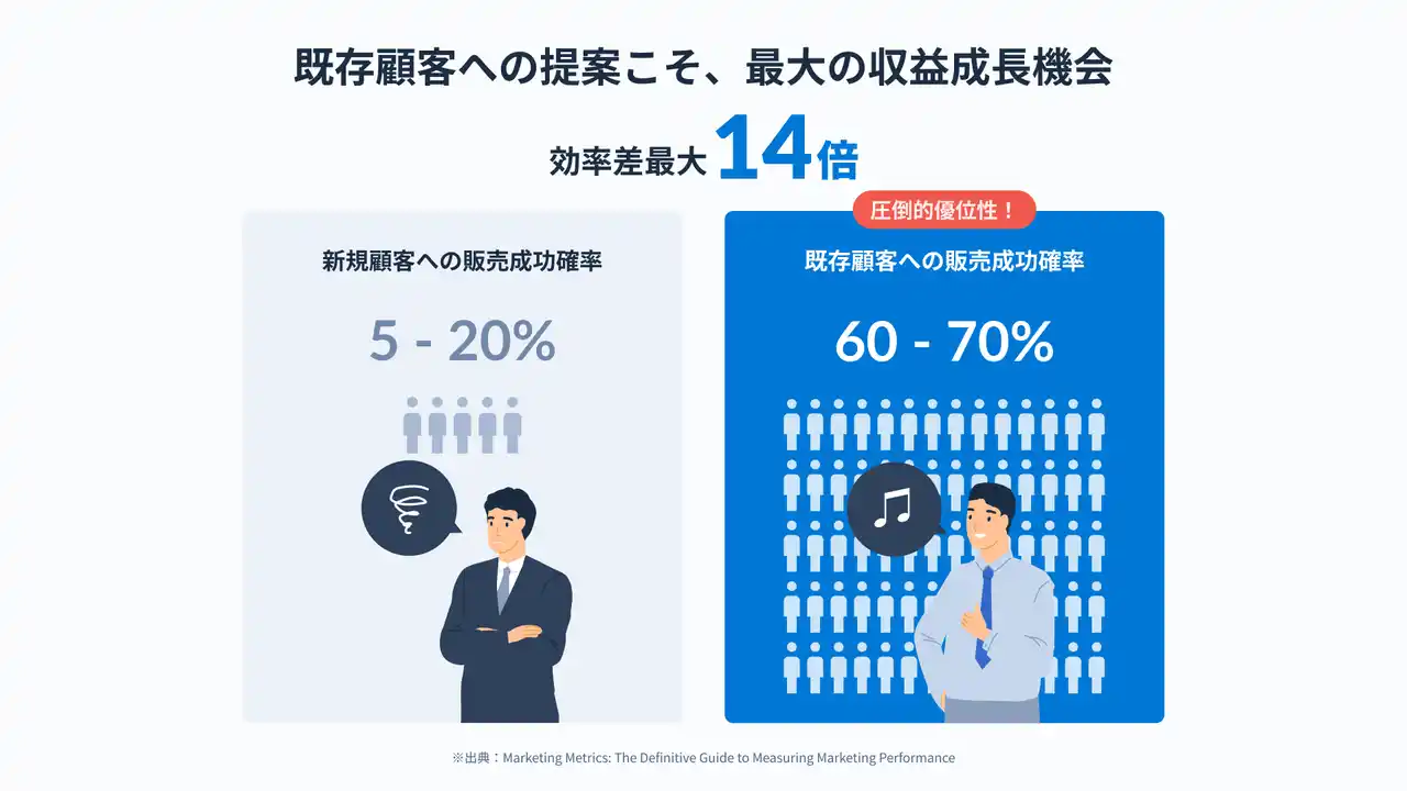 日本企業の多くが、人口減・既存事業の縮小・事業承継といった構造的な課題に直面しています。新規開拓にはコストも時間もかかる一方、既存顧客への販売成功率は新規見込み客の最大約14倍(※)。「既存顧客という資産を、もっと収益につなげたい」というニーズが高まっています。 |