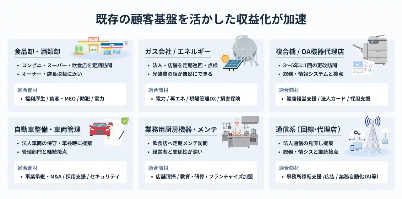 仕入れ交渉も直接契約も不要で提案できる商材が広がる仕組みとして、特に顧客基盤を持つ企業の参画が加速しています。 |