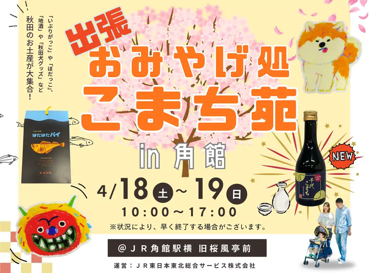 JR秋田駅2階で土産物販売店「おみやげ処 こまち苑」を運営するJR東日本東北総合サービス株式会社(本社:宮城県仙台市、代表取締役社長:弭間 俊則)は、2026年4月18日(土)~19日(日)にJR角館駅で「出張 おみやげ処 こまち苑」を開催します。秋田県内のお土産や雑貨、地酒などを販売し、角館にお越しのお客さまに秋田の魅力を存分にお届けします。皆さまのご来場を心よりお待ちしております。 |