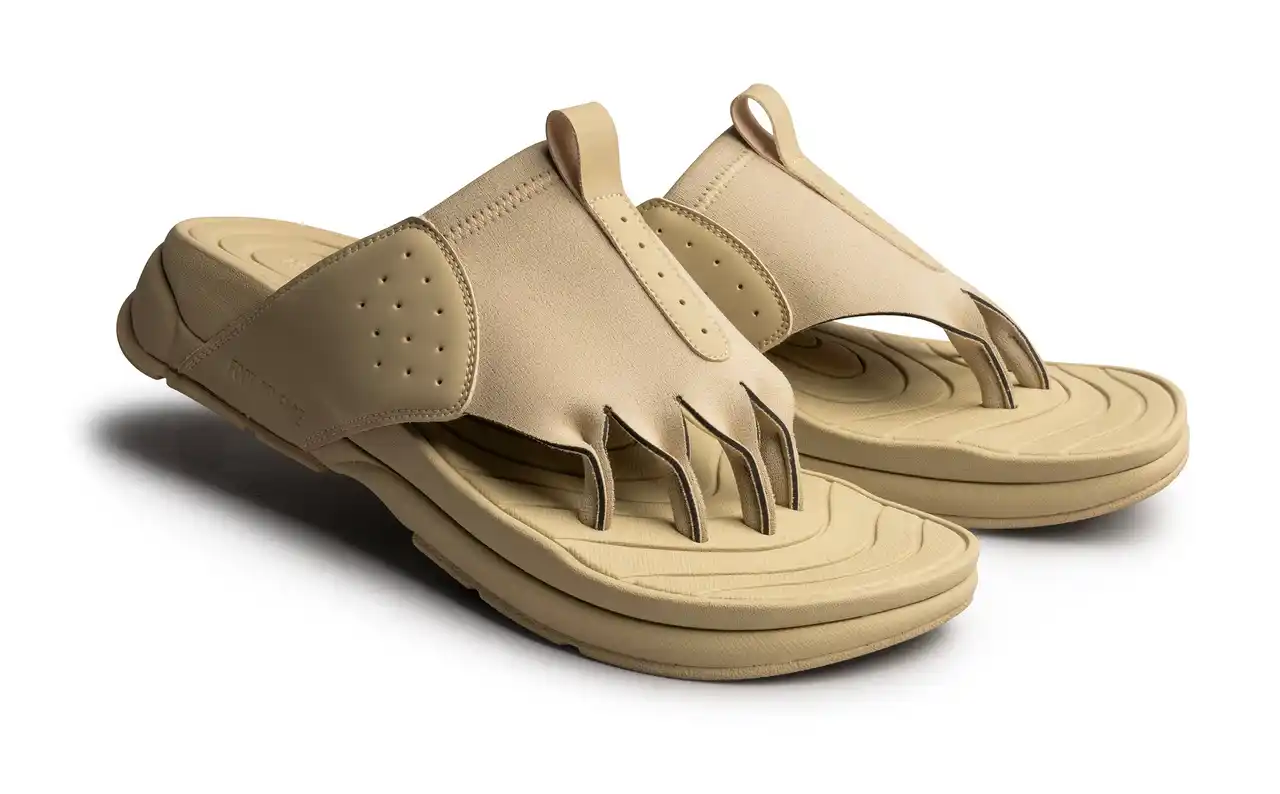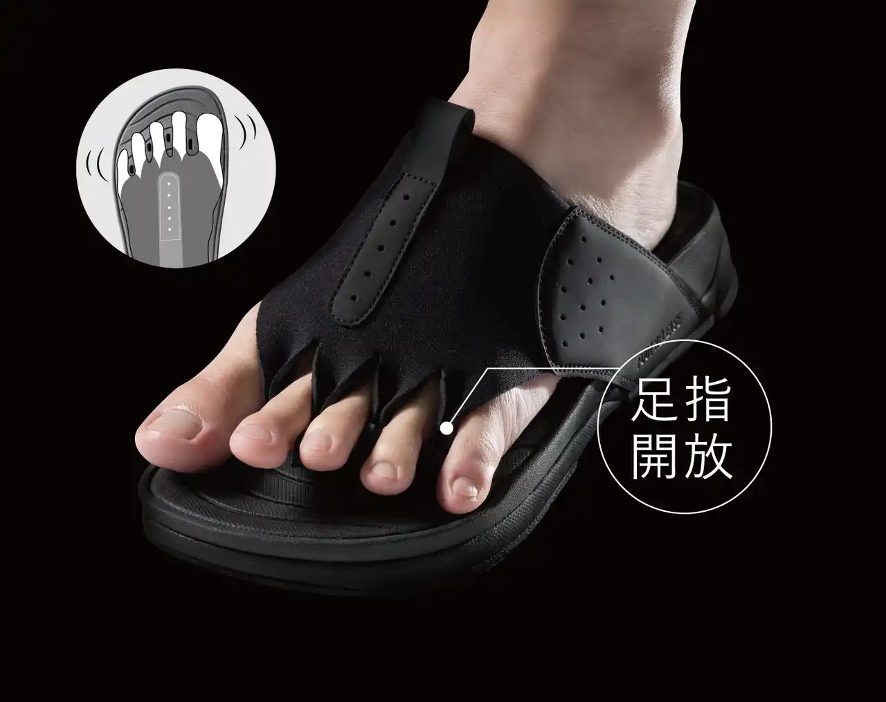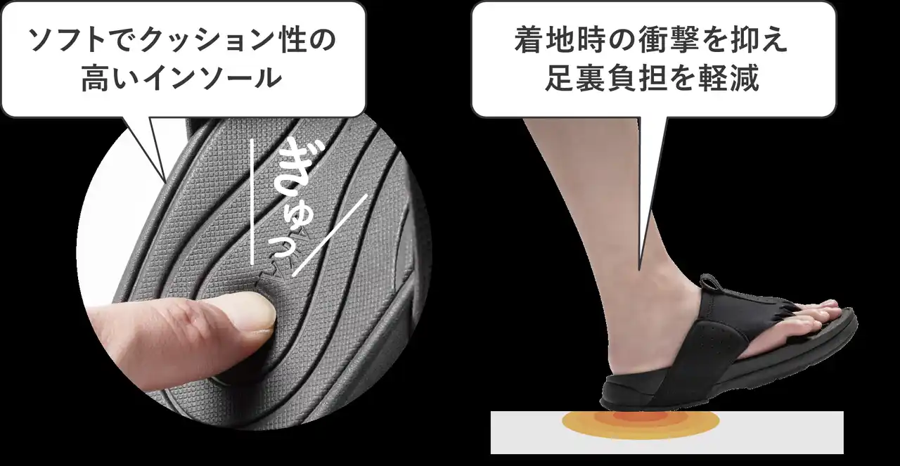 スポーツや立ち仕事の後に靴内で縮こまりがちな5本指を、4本の鼻緒がひらき、開放された状態へ導きます。 |