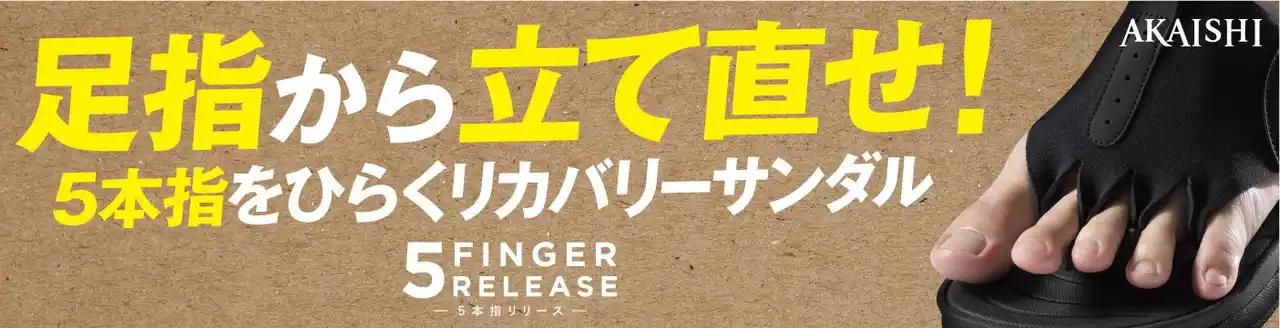 足のお悩みに特化した靴を研究開発しているメーカー株式会社AKAISHI(本社:静岡県静岡市、代表取締役:赤石恒一)は、2021年の発売より好評いただいておりますリカバリーサンダル【フットリリース】シリーズより、第3弾となる新商品「フットリリース 5本指リリース」を2026年4月24日(金)より販売開始いたします。 |