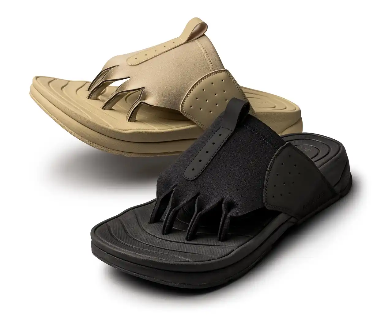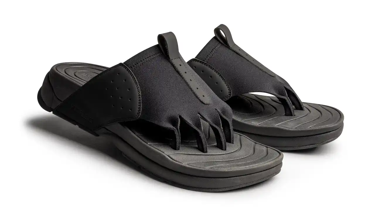 AKAISHIのリカバリーサンダル第3弾「フットリリース 5本指リリース」はスポーツや立ち仕事で縮こまりがちな足指を、4本の鼻緒構造でしっかりと広げ、自然に開放された状態へ導きます。独自のインソール形状によるアーチサポート、アッパーにはウェットスーツにも使用される柔らかく伸縮性の高い素材を採用し、足指の間への当たりを軽減します。 |