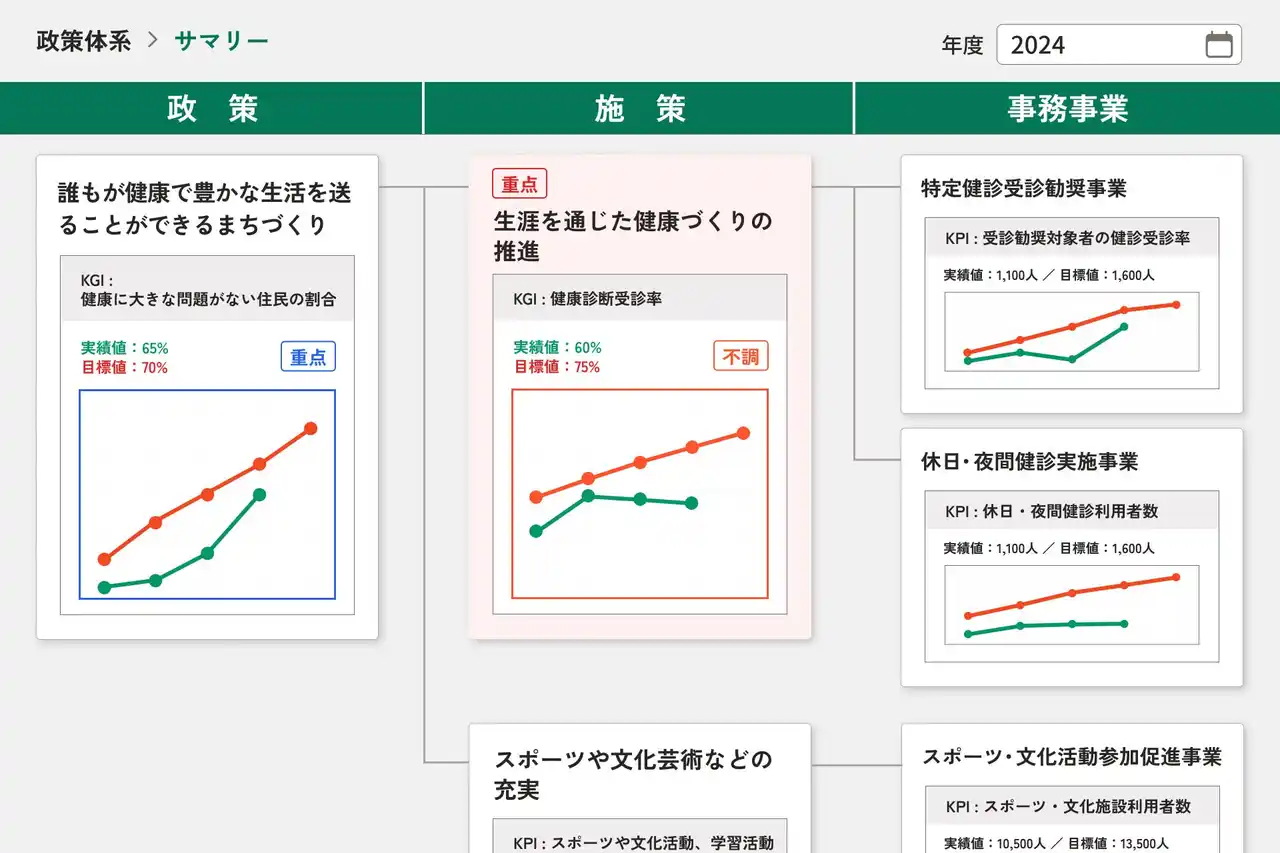 「政策ー施策ー事業」の繋がりを、指標の進捗状況と併せてツリー構造で可視化します。上位目的と照らし合わせながら、どの事業に予算を投下するべきかを筋良く考えることが可能となり、DDPや予算編成での活用を支援します。また、政策体系の見直しや事業の統廃合が生じても、指標の紐づけ先を柔軟に変更できる機能を提供します。 |