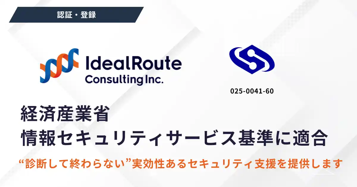 アイディルートコンサルティング株式会社(本社:東京都千代田区、代表取締役:石川 耕、以下:当社)は、提供する脆弱性診断サービスが、経済産業省の定める「情報セキュリティサービス基準」に適合し、登録サービスとして認められたことをお知らせします。 |