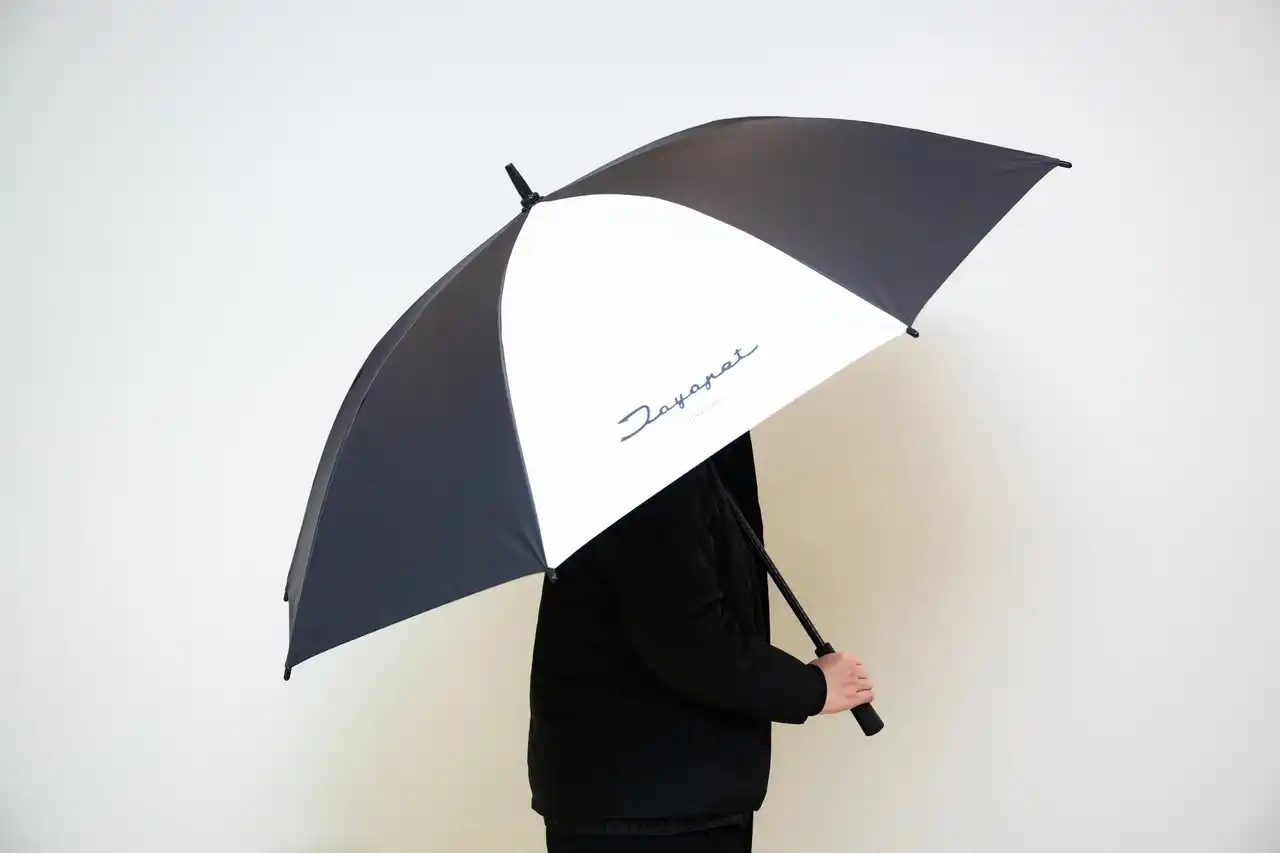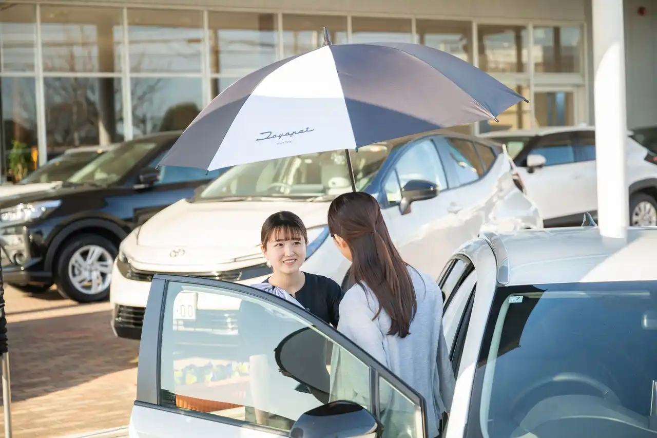 雨の日のご来店時や、屋外でお車をご覧いただく際、お客様に触れる「傘」もまた重要なおもてなしの一部であると考え、このたびのデザイン・機能刷新に至りました。 |